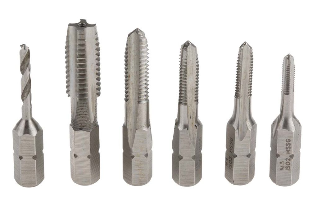 This set features taps to accommodate the following thread sizes: M3, M4, M5, M6, M8 and M10. There is also 6 drills suitable for each size tap.