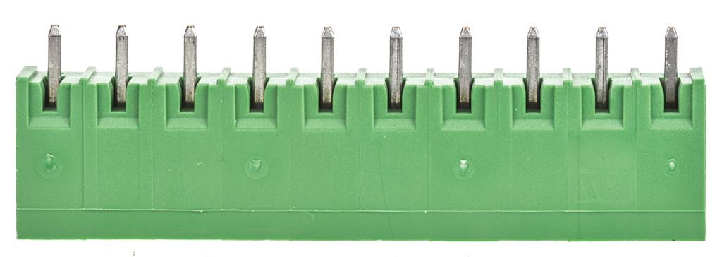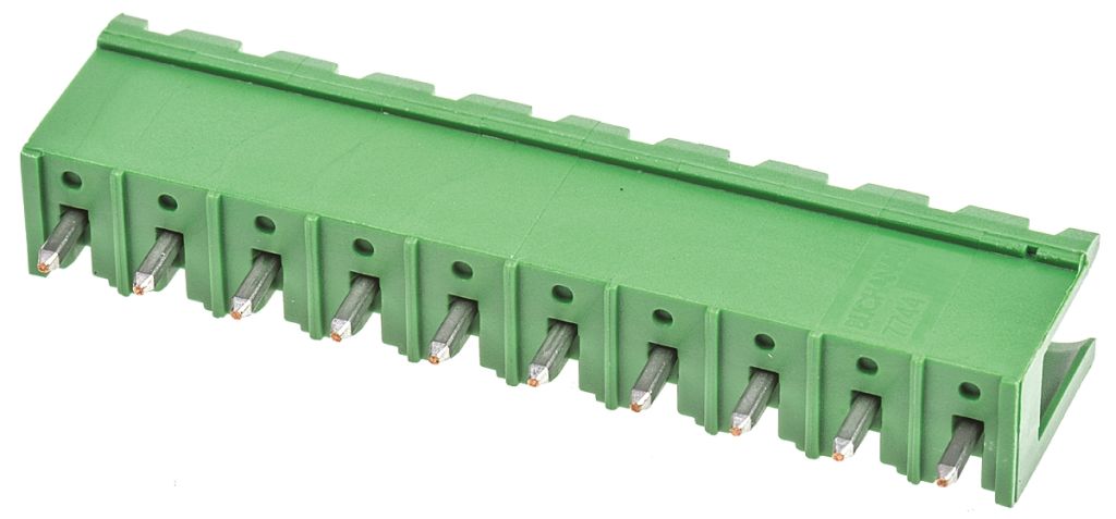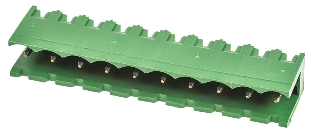 TERMI-BLOK 5..08mm vertical mount open end headers with threaded flange and polarization keying slots. These TERMI-BLOK 5.08mm open end PCB header terminal block connectors are side stackable and are made from green polyamide 6.6 GF.