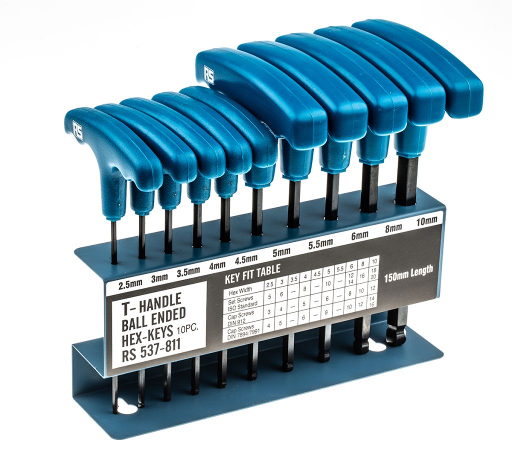 From RS PRO, this high-quality T-handle hex key set is a handy way to keep differing allen key sizes all in one place. The rubberised t-handles ensure that applying torque is easy and efficient, and the range of sizes means you're fully prepared for precision hex driving applications.