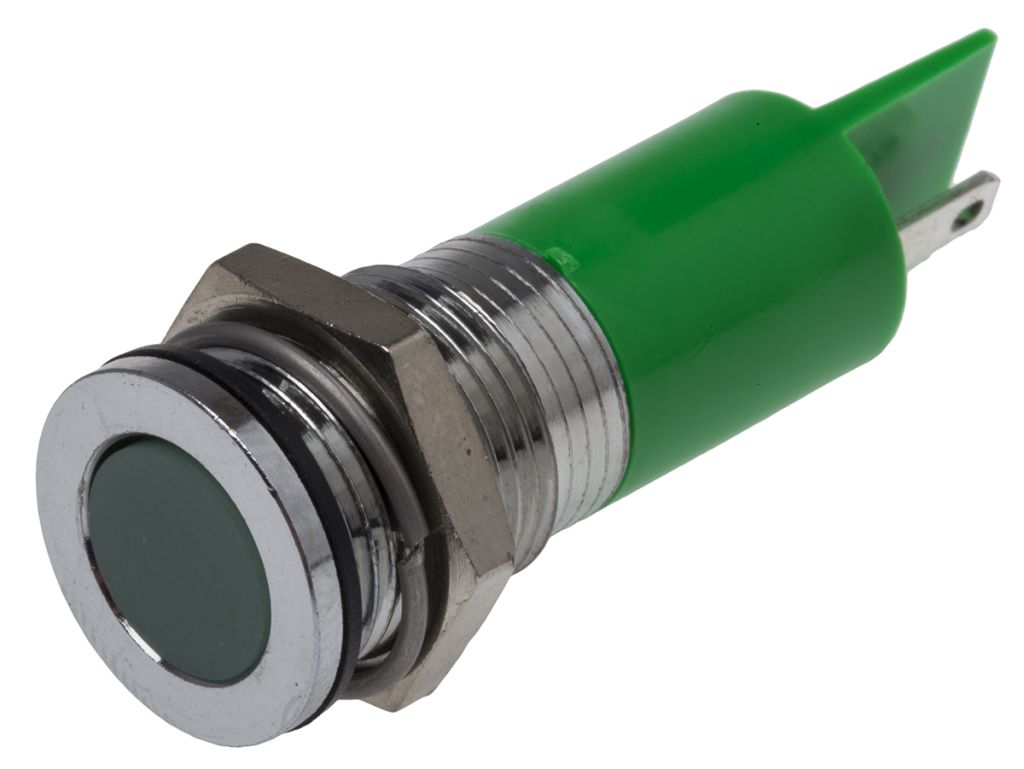 RS 14mm panel mount hyper bright LED indicators, with 10mm coloured diffused epoxy lens, available in prominent or flush bezel styles. Applications they are typically used in include: process controls, professional electrical appliances, communication, radars, civil engineering vehicles, trucks, diggers, cranes, trains, HVAC, energy management applications, lifts and machine tools.