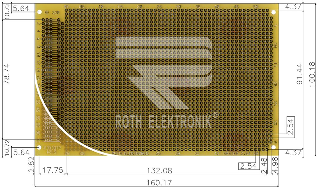 | Product description | Roth Elektronik Single Sided Matrix Board FR4 With 37 x 53 1mm Holes, 2.54 x 2.54mm Pitch, 160 x 100 x 1.5mm |