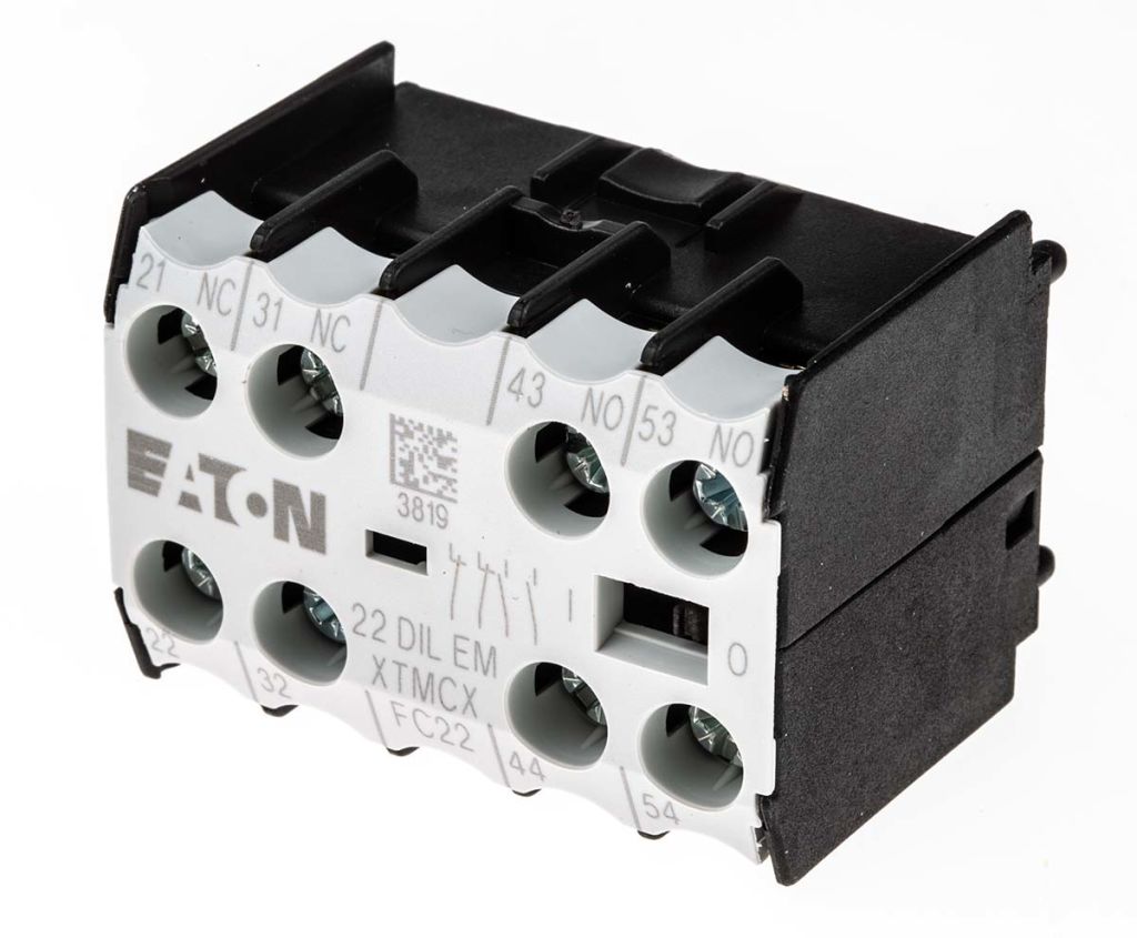 An Auxiliary Contact block, or aux contact, is an electromechanical device that is mounted typically to contactors. They are physically connected to the contactor, with simultaneous activation and deactivation applying to both the contact block and the contactor at the same time.