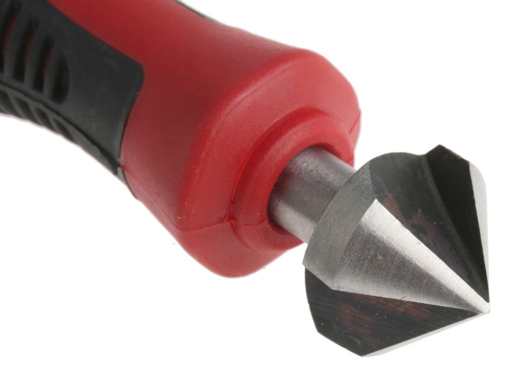 Countersink hand tool with red/black injection grip used for deburring holes in metal, wood and plastic. These HSS hand countersinks are ideal for any tool kit and offers a cost-effective solution with high performance and durability.
