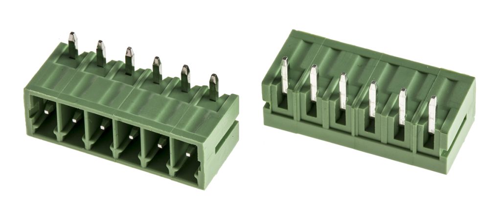 3.5mm pitch horizontal mount PCB terminal block headers made from green UL94-V0 flame retardant PA66 with a closed end design and polarised mouldings. These 3.5mm pluggable PCB terminal block headers have tin plated phosphor bronze terminals and mate with 3.5mm pitch female terminal block plug connectors, see stock number 897-0998 typically