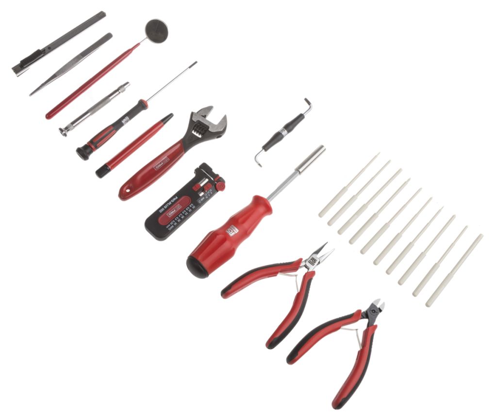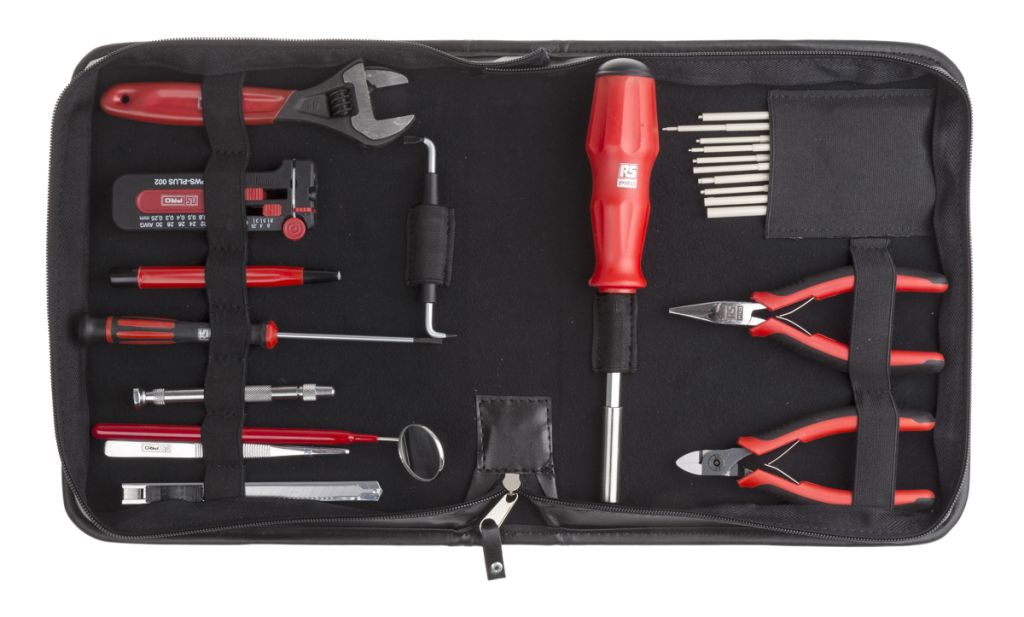 RS Pro 32 piece electronics tool kit, offering a variety of tools to make a comprehensive kit ideal for DIY and professional user. All supplied in carry-case for storage and organisation.