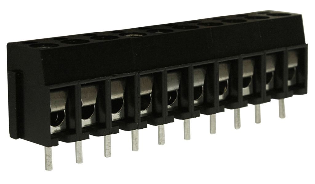 5mm pitch standard profile PCB teminal blocks with screw terminals and black UL94-V0 flame retardant PA66 housings. These 5mm standard profile terminal blocks have stainless steel wire protectors, M3 nickel plated stainless steel screws, guided pin alignment and accept a wire size range of 0.3-2mm2 (22-14 AWG).