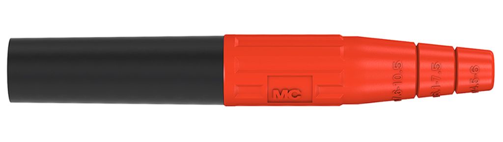 Multi-Contact 6 mm safety socket features a crimp connection with a cable capacity of up to 10.5mm diameter, for mating with KST6AR-N series of plugs or the 6 mm safety flush mounting plugs, utilised with a flush mounting plug it acts as an appliance connector and with the plugs as an inline coupling. The insulator body allows for a maximum cable cross section of 10.5 mm2, suitable for many applications that call for a 6 mm diameter socket connector. The socket connector insulator is assembled over an associated cable prior to assembly, it is then crimped and the insulator pushed over the crimped article to finalise and complete the KBT6AR-N inline socket connector assembly.