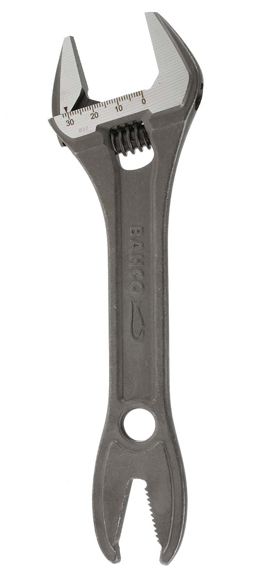 The Bahco adjustable wrench is tool used by many professionals and is made from high performance alloy steel with a phosphated finish. It has a 32mm jaw capacity and alligator jaws at one end.