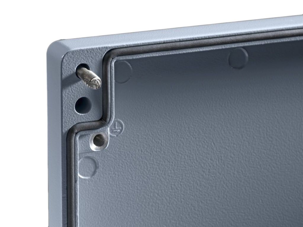 The GE Series enclosures are grey (RAL 7001) powder coated and made from cast aluminium. Enclosures feature additional drilled and tapped holes for securing support rails or mounting plates. A lid is designed to be secured by captive screws for maximum security and the integrated seal guarantee high IP66 rating. The neoprene cord seal is oil, petrol and chemical resistant.