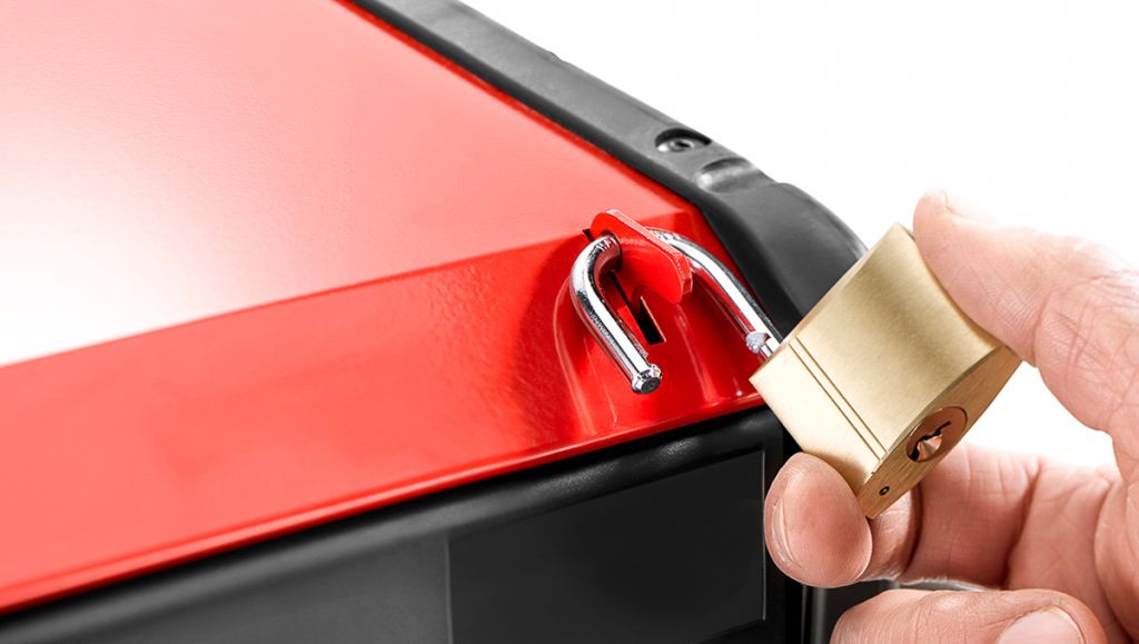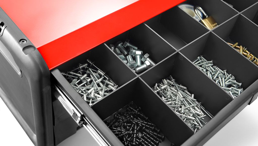 The tool chest comes with one set of partitions. Making the drawers customisable to suit storage demands. Each drawer has a sliding safety latch, and the tool chest has an overall locking system (padlock not included).