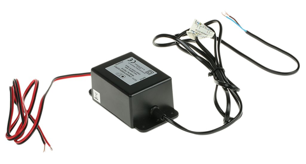 Designed as a power supply for CCTV internal cameras but suitable for a wide range of other applications. Sealed into a black ABS plastic case with 1m of mains lead and 1m of colour coded low voltage lead (unterminated). Rated up to 1A and protected by an internal overload thermal cut-out (non-resettable).