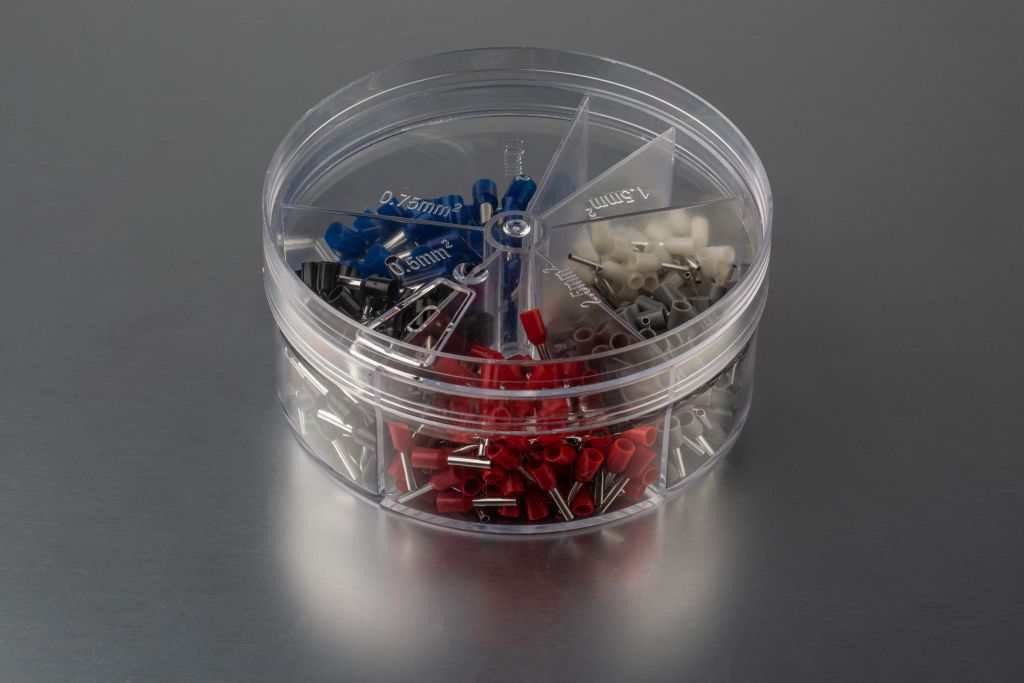 From RS PRO a handy crimp terminal kit containing an assortment of 400 high-quality DIN 46228 standard colour coded insulated bootlace ferrules (also known as cord end ferrules or wire end ferrules). These wire ferrules range from size 0.5 mm² through to 2.5 mm² and are stored in separate compartments within a clear circular box for easy selection. This kit is portable and ensures you are equipped with all the necessary terminal sizes when it comes to terminating conductors wherever you are working.