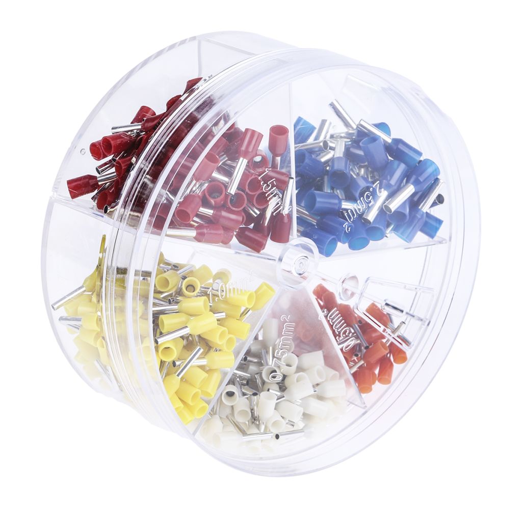 From RS PRO a handy crimp terminal kit containing an assortment of high-quality German colour coded insulated bootlace ferrules (also known as cord end ferrules or wire end ferrules). These wire ferrules range from size 0·5 mm² through to 2.5 mm² and are stored in separate compartments within a clear circular box for easy selection. This kit is portable and ensures you are equipped with all the necessary terminal sizes when it comes to terminating conductors.