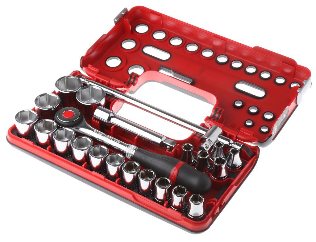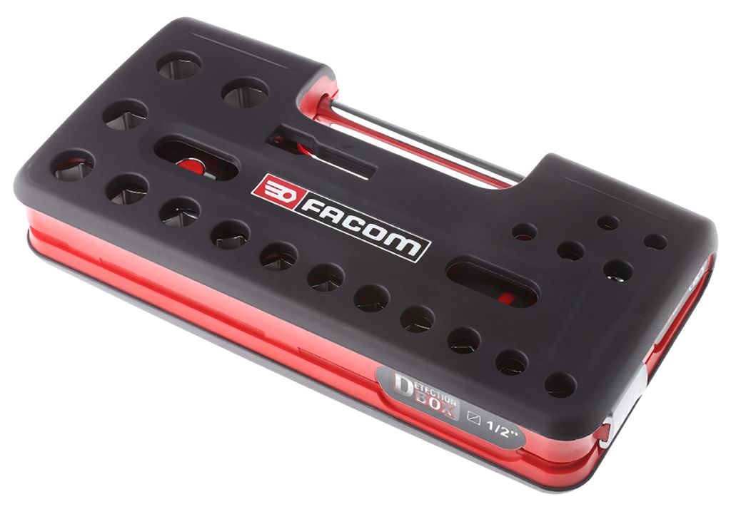 Introducing a compact 1/ 2inch ratchet and socket set from Facom. This is a professional standard hand tool set featuring a ratchet, sockets, extension and a T-handle bar all presented in a unique storage case for easy storing and tool protection. A set like this performs many professional and DIY tasks and as such, is a very versatile, an essential kit for anyone to own, especially with how portable it is.