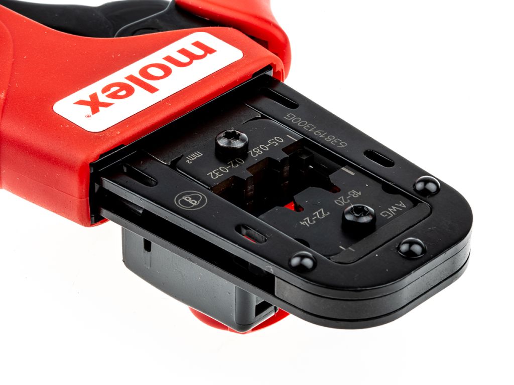 From Molex a PremiumGrade manual crimping tool made from high-quality materials and designed to crimp to a high specification. This PremiumGrade crimp tool has been tested to a minimum of 50000 cycles. If the tool is looked after and maintained it produces crimps to the highest specification during this life span. This crimping tool consists of two ergonomically designed soft grip handles with an adjustable preload force, ratchet mechanism, die assembly and terminal locator.