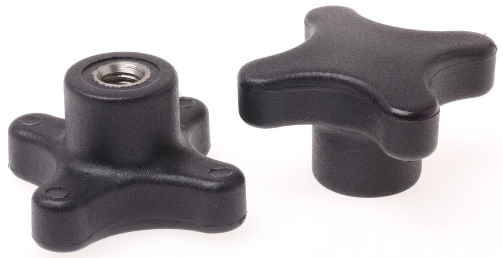 These cross-shaped handwheels from RS PRO are an ergonomic shape to ensure user comfort and ease of use. The knob handles are made from impact-resistant thermoplastic bodies and male knobs are fitted with a protruding screw insert (male) of either stainless steel or zinc-plated steel. Female knobs and threaded though knobs have threaded inserts of zinc-plated or stainless steel. Zinc-plated steel and stainless steel both provide wear resistance for the threads to ensure that the threads last throughout general use and are not easily damaged or sheared.