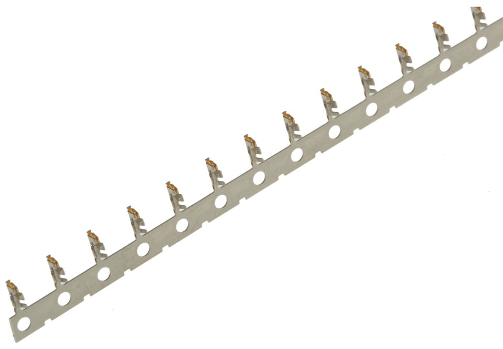 Crimp receptacle contacts for use with DF20 series socket connectors. These crimp socket contacts are made from gold plated phosphor bronze and are available in two sizes: stock number 685-0757 is for wire sizes 28-30 AWG and stock number 779-4761 is for wire sizes 30-32 AWG.