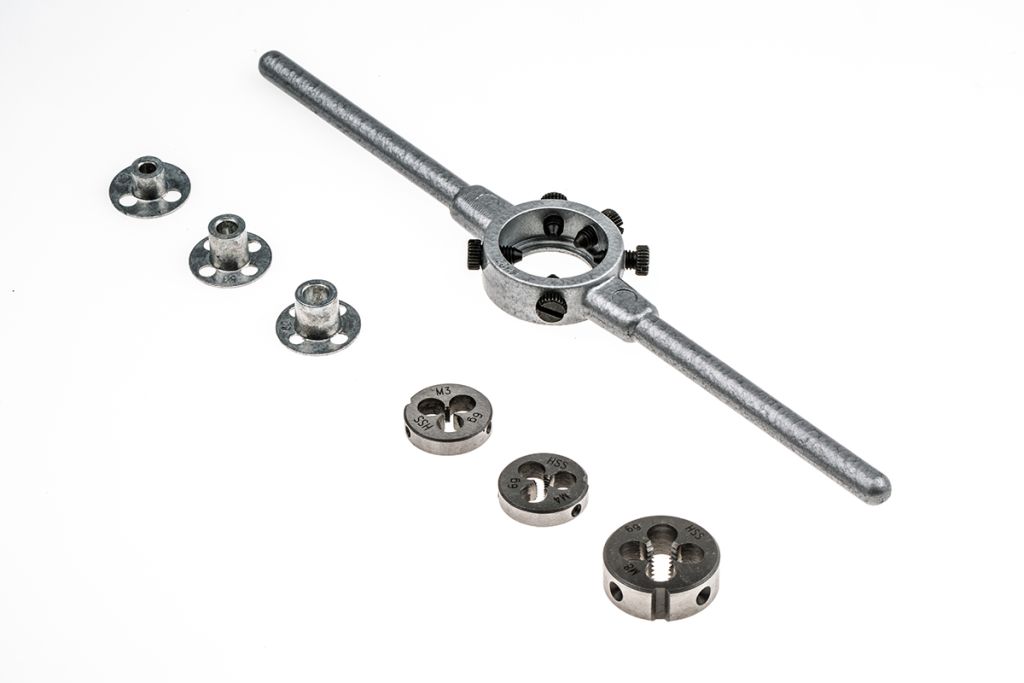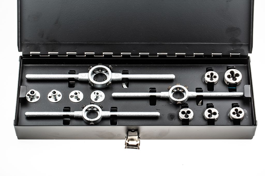 With a hand held die set, select the required die head and secure it in to the die cast. Once securely in place simply place the die set onto the material to be threaded and gently rotate. As it rotates, the die will begin to cut a thread into the material. It is recommended to back the die off half a turn to remove debris after every two full turns.