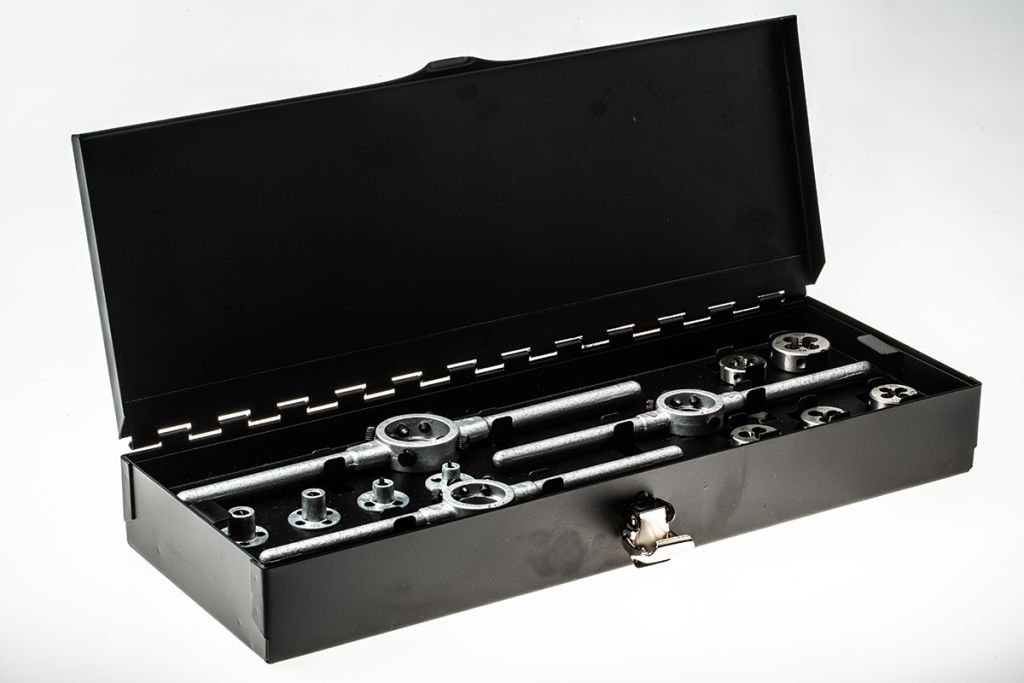 A tap set is used to create or repair threads in holes which is ideal for things such as nuts and fittings, this process is called tapping. Die sets are used to cut threads on materials such as steel to allow a fitting to be screwed on and attached, this is called threading.