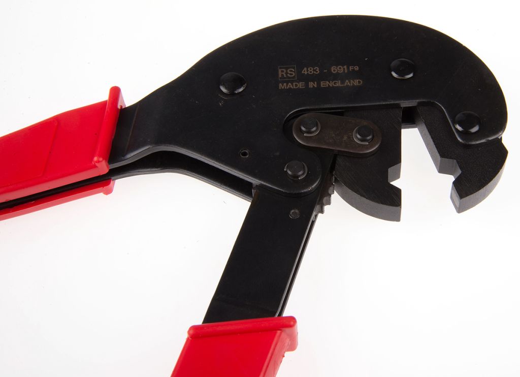 A non-ratchet, cam-action crimping tool with hexagon die set to crimp F series connectors,To assemble just prepare cable termination with stripping tool (stock no 433-270) and cassette (stock no 457-327) and fold the braid back,Fit the cable fully into the connector and ferrule over the braid