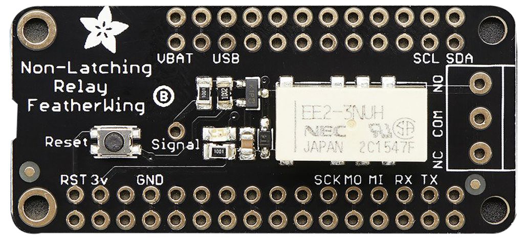 A Latching Relay FeatherWing is also available (RS 124-5527) but requires two signal pins.