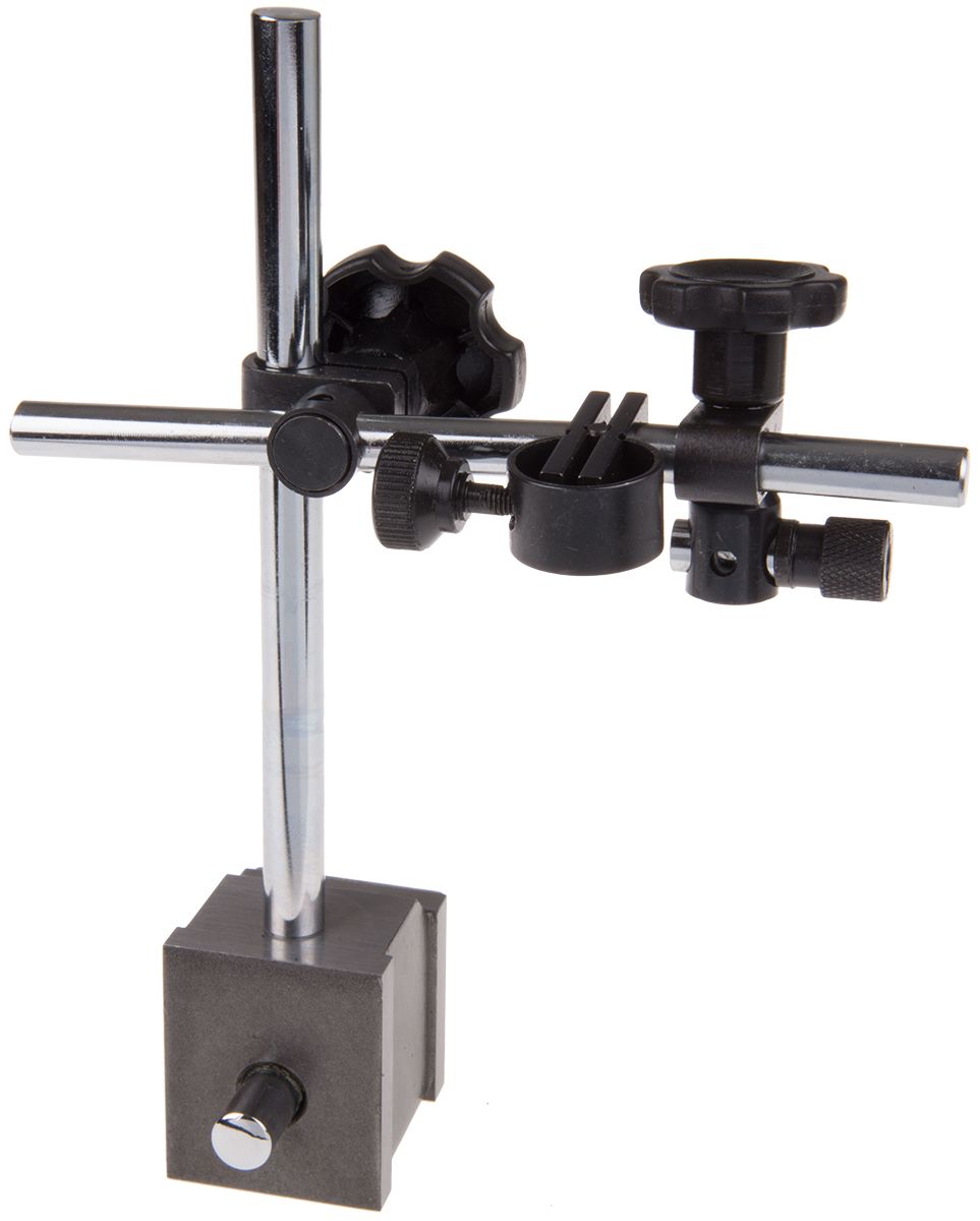 RS Pro range of professional, switchable magnetic bases with a solid cross arm. These bases are useful as a stand and are suitable for holding and clamping plunger dial indicators or lever indicators for precision-controlled measurements. The bases are magnetic so that they can be attached to metal surfaces securely without the need for screws. The base features a V cut which is ideal if the base needs to be attached to a round object.