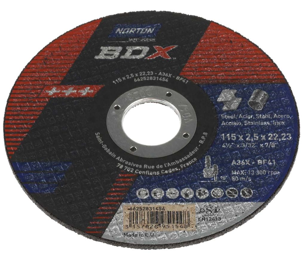 | Product description | Norton Cutting Disc Aluminium Oxide Cutting Disc, 115mm x 2.5mm Thick, P36 Grit, BDX, 5 in pack |