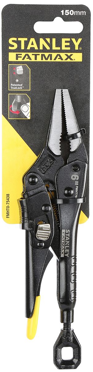 The FatMax long nose lock-grip pliers from Stanley are made from high performance steel with a rust resistant finish. The locking pliers have the TruLock mechanism for unintentional release of the jaw. They can be locked into position and have eyebolts to give you higher torque tightening and faster winding