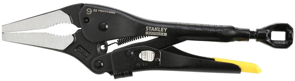 The FatMax long nose lock-grip pliers from Stanley are made from high performance steel with a rust resistant finish. The locking pliers have the TruLock mechanism for unintentional release of the jaw. They can be locked into position and have eyebolts to give you higher torque tightening and faster winding