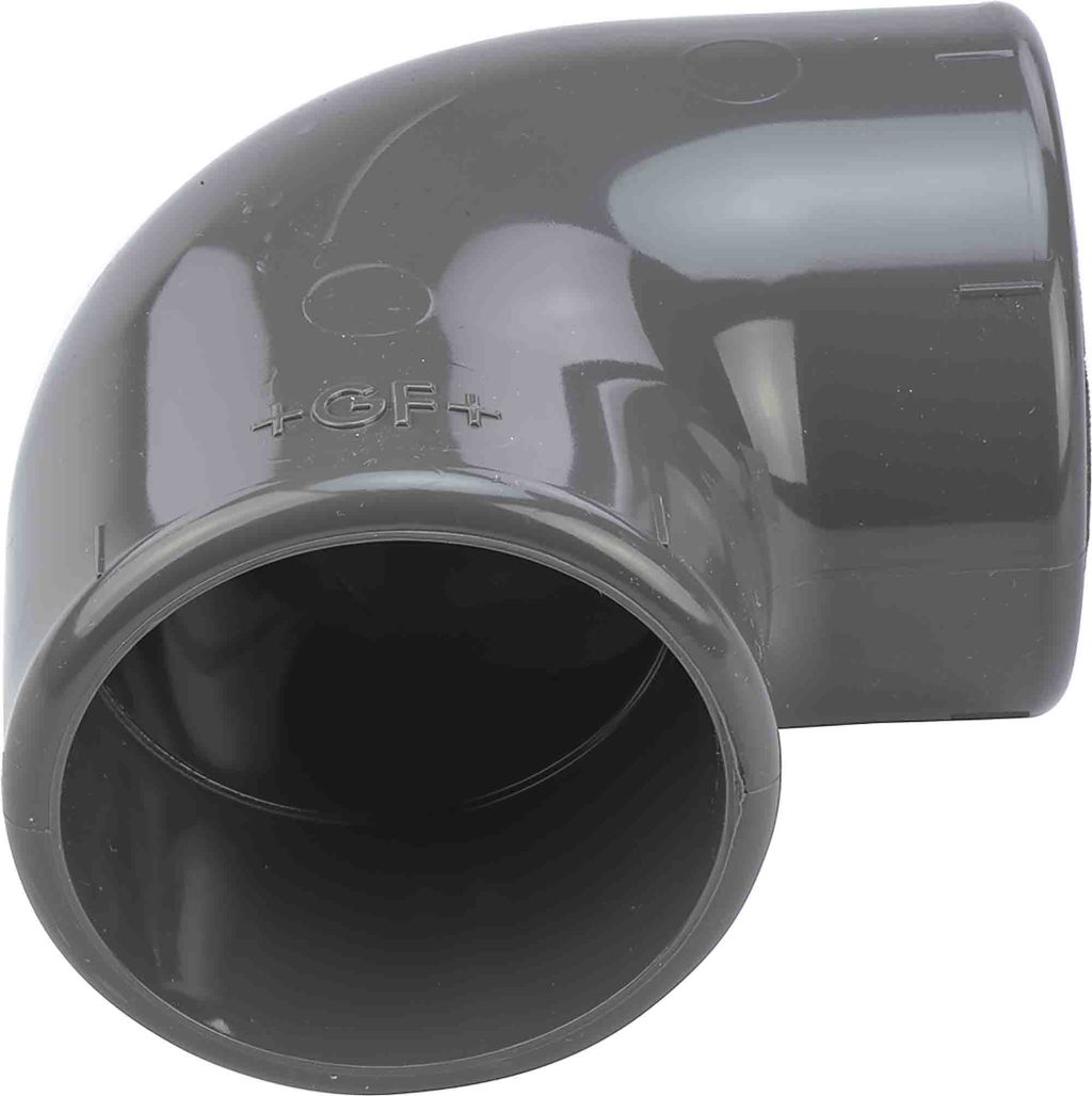 Elbow 90° PVC-U, available in either metric or imperial versions. Suitable for use in the chemical processing, microelectronics, ship building and water treatment industries.