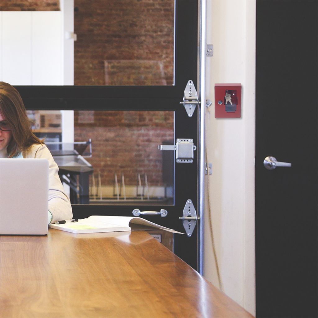 The emergency key cabinet is designed to hold a restricted key near a locked door for emergency use only. The glass face can be broken if anyone needs to leave a building in an emergency