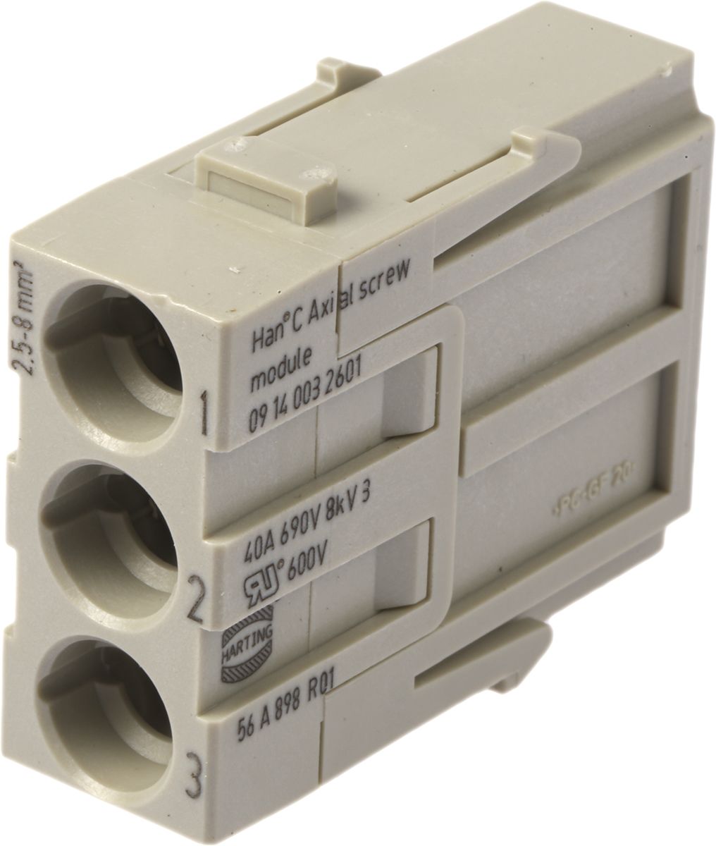 | Product description | HARTING Han-Modular Heavy Duty Power Connector Module, 3 contacts, 40A, Male |