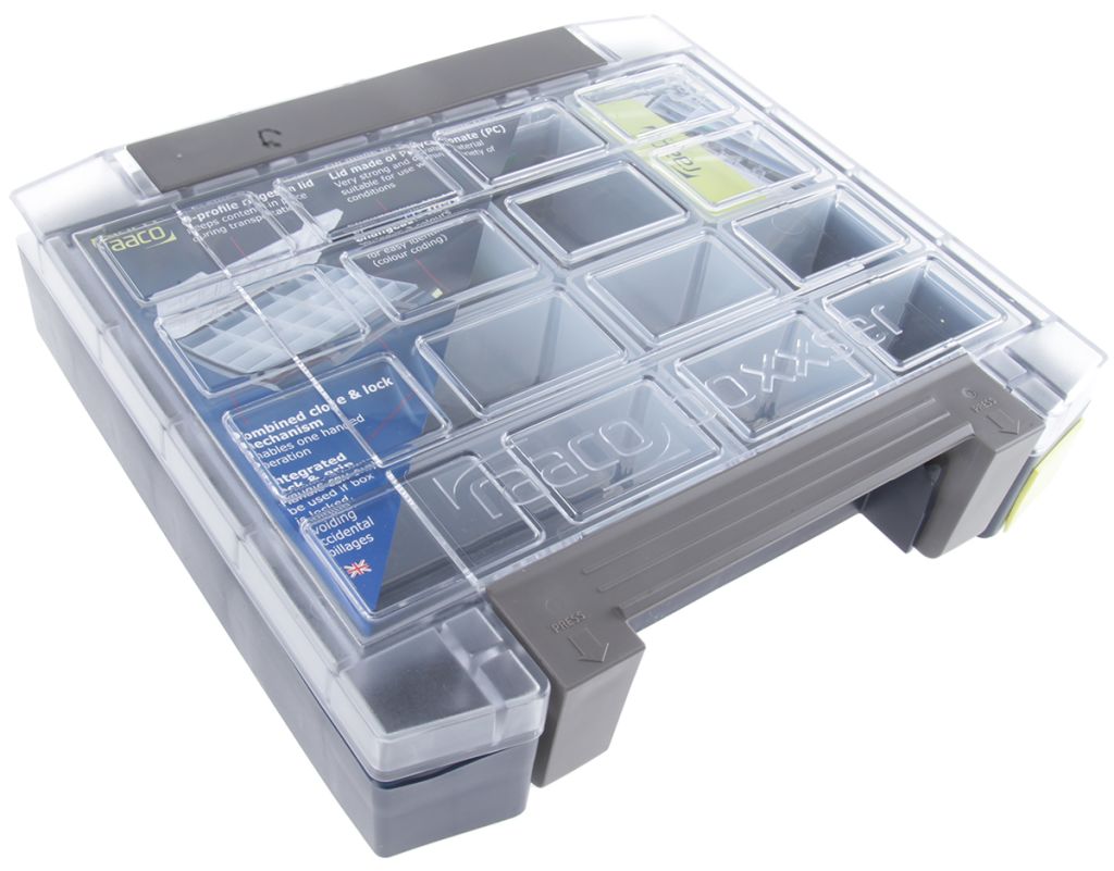 A comprehensive range of assorted boxes offering excellent mobility and well arranged storage options. Made in highly durable polypropylene with a strong polycarbonate lid, each box is designed to work with a system of high quality removable inserts. A wealth of practical features is built into each box ensuring they meet and surpass the rigours and demands of the professional marketplace. Available in a range of sizes and configurations with the added flexibility that allows for boxes to be uniquely configured, if required, using packs of inserts that accompany the range. All products benefit from Raaco's 10 year no quibble guarantee.