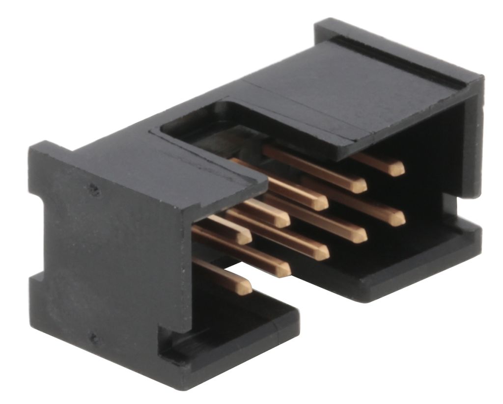 AMP-LATCH PCB header connectors with a 2.54 x 2.54 mm centreline and a low profile design. These AMP-LATCH headers have a centre polarizing slot and double bar polarization slots for accurate mating with the IDC ribbon cable connector. The housings are made from flame retardant 94V-0 rated thermoplastic and feature board standoffs to allow excess flux removal from the PCB. Versions of these AMP-LATCH low profile headers feature kinked soldertails for a secure connection to the PCB
