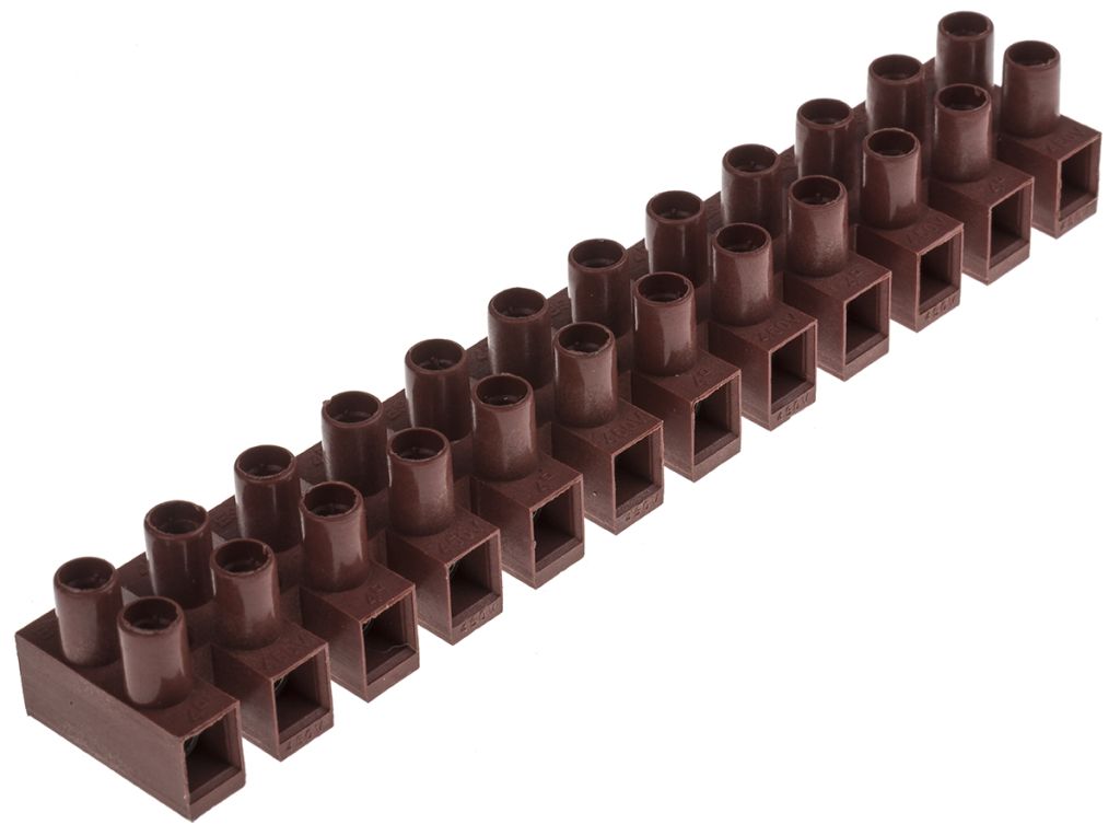 RS semi-rigid high temperature (160°C) polyamide/glass fibre terminal blocks with wire protector, nickel plated brass inserts and galvanised steel screws which are captive and raised for easy wiring.