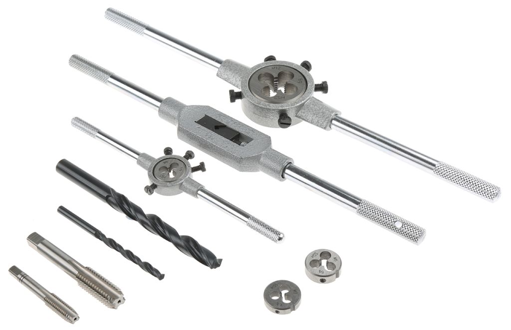 A tap set is used to create or repair threads in holes which is ideal for things such as nuts and fittings, this process is called tapping. Die sets are used to cut threads on materials such as steel rods to allow a fitting to be screwed on and attached, this is called threading.
