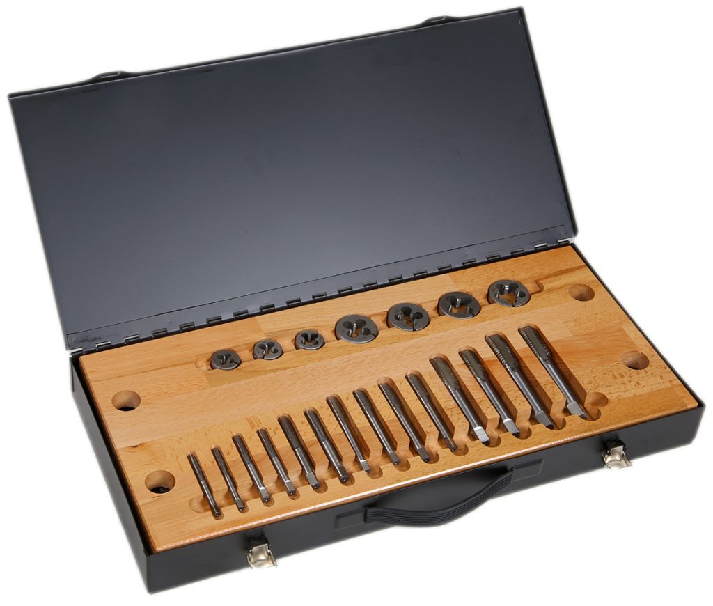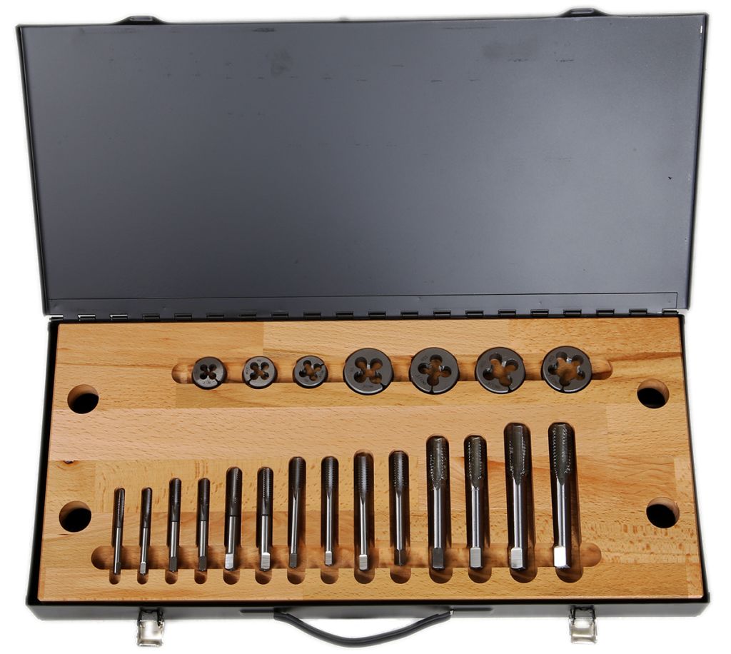 A tap set is used to create or repair threads in holes which is ideal for things such as nuts and fittings, this process is called tapping. Die sets are used to cut threads on materials such as steel to allow a fitting to be screwed on and attached, this is called threading.