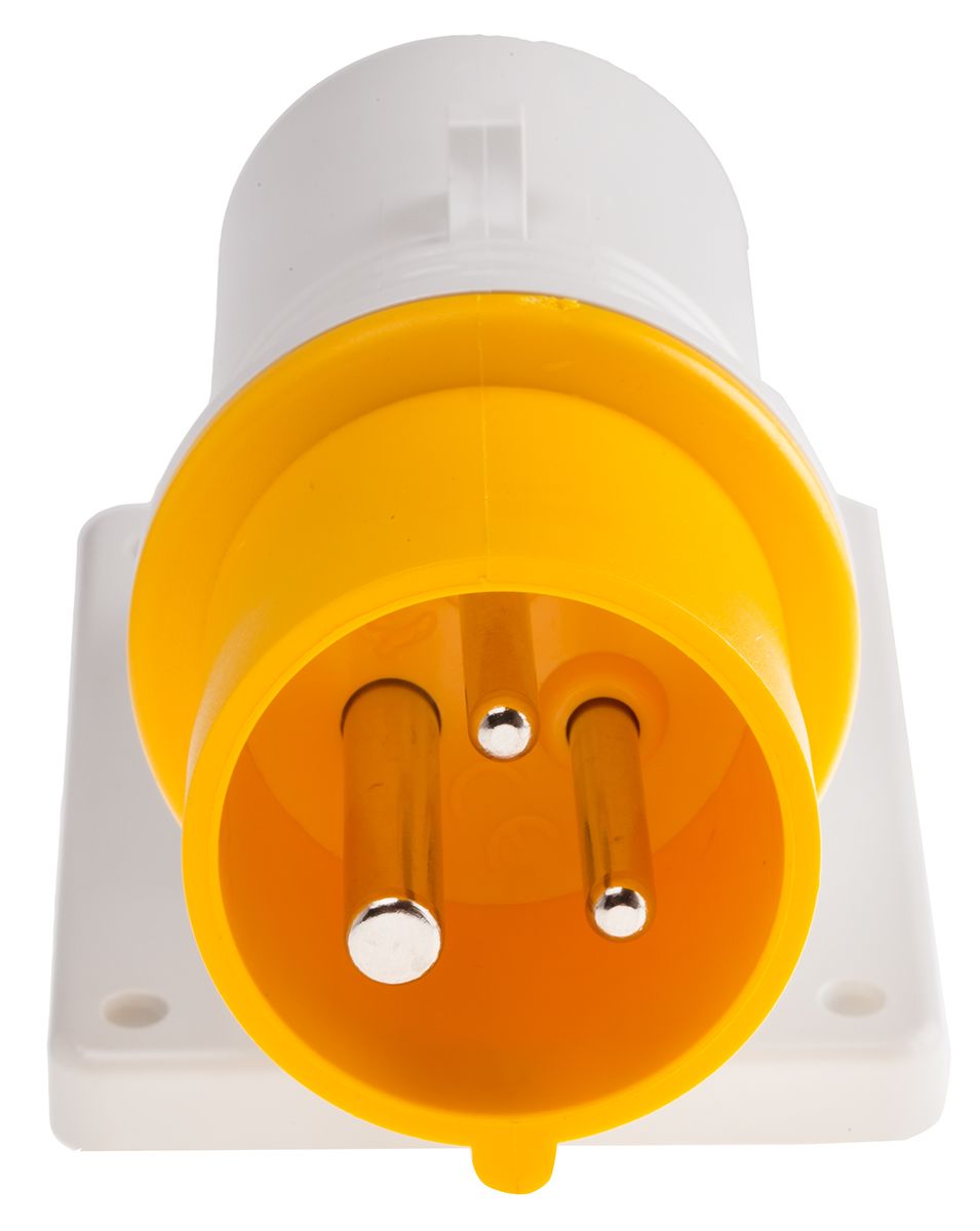 Product description RS PRO IP44 Yellow Wall Mount 2P+E Right Angle Industrial Power Plug, Rated At 16A, 110.0 V