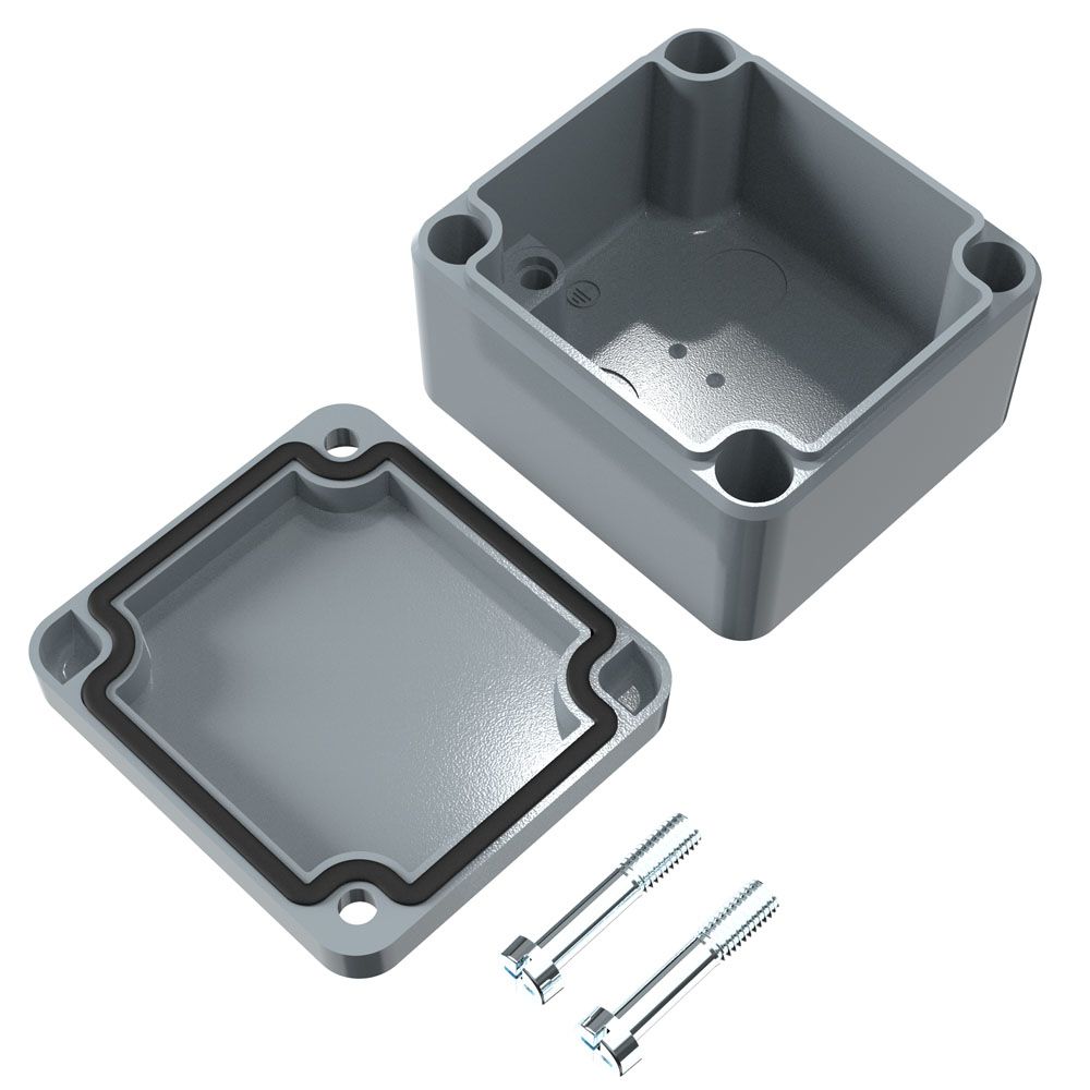 Aluminium enclosure consisting of lid, seal, Including Stainless Steel screws base with 2 or 4 earthing screws.