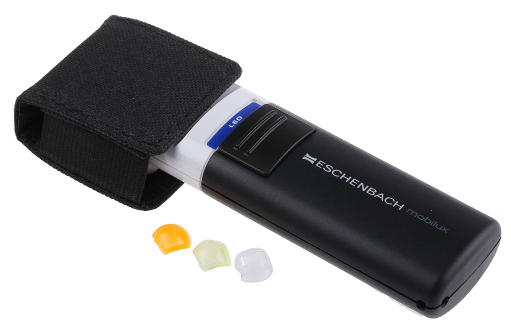 Manufactured in Nuremberg Germany, the mobilux LED illuminated magnifiers are ideal for reading small print both in the office and when you’re on the move, e.g. when you’re searching for telephone numbers or looking at spreadsheets. They incorporate a large, easy to use light switch that operates a choice of 2 different colour of light through the use of the supplied filter. The included AA batteries are easy to change and the magnifier has a handy eyelet on the end of the handle for round-the-neck-cord. A case is provided to protect the aspheric lens.