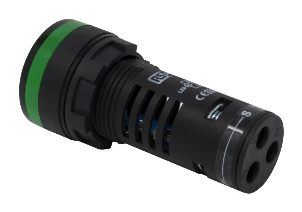 | Product description | RS PRO, Panel Mount Green LED Pilot Light Complete With Test Circuit, 22mm Cutout, IP65, Round, 110V ac/dc |