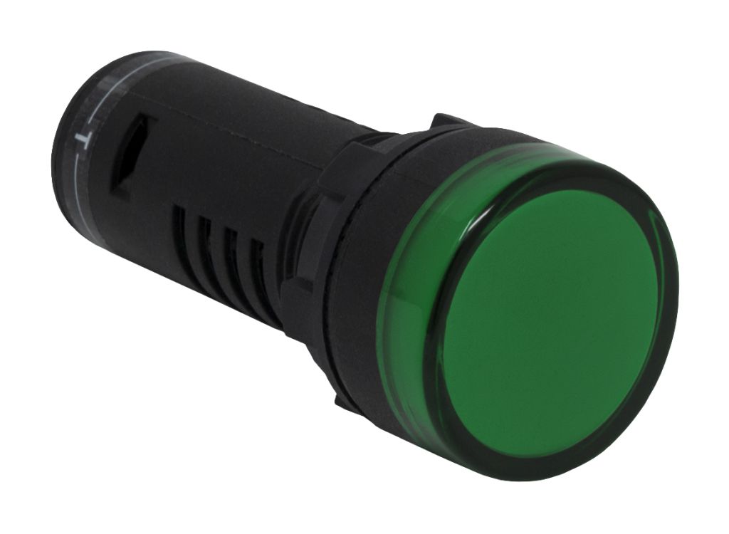Product description RS PRO, Panel Mount Green LED Pilot Light Complete With Test Circuit, 22mm Cutout, IP65, Round, 12 V ac/dc