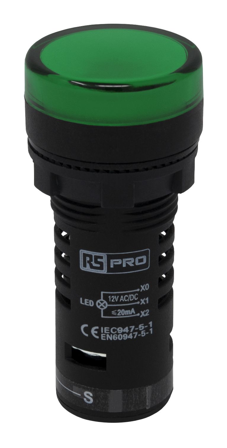 | Product description | RS PRO, Panel Mount Green LED Pilot Light Complete With Test Circuit, 22mm Cutout, IP65, Round, 12 V ac/dc |