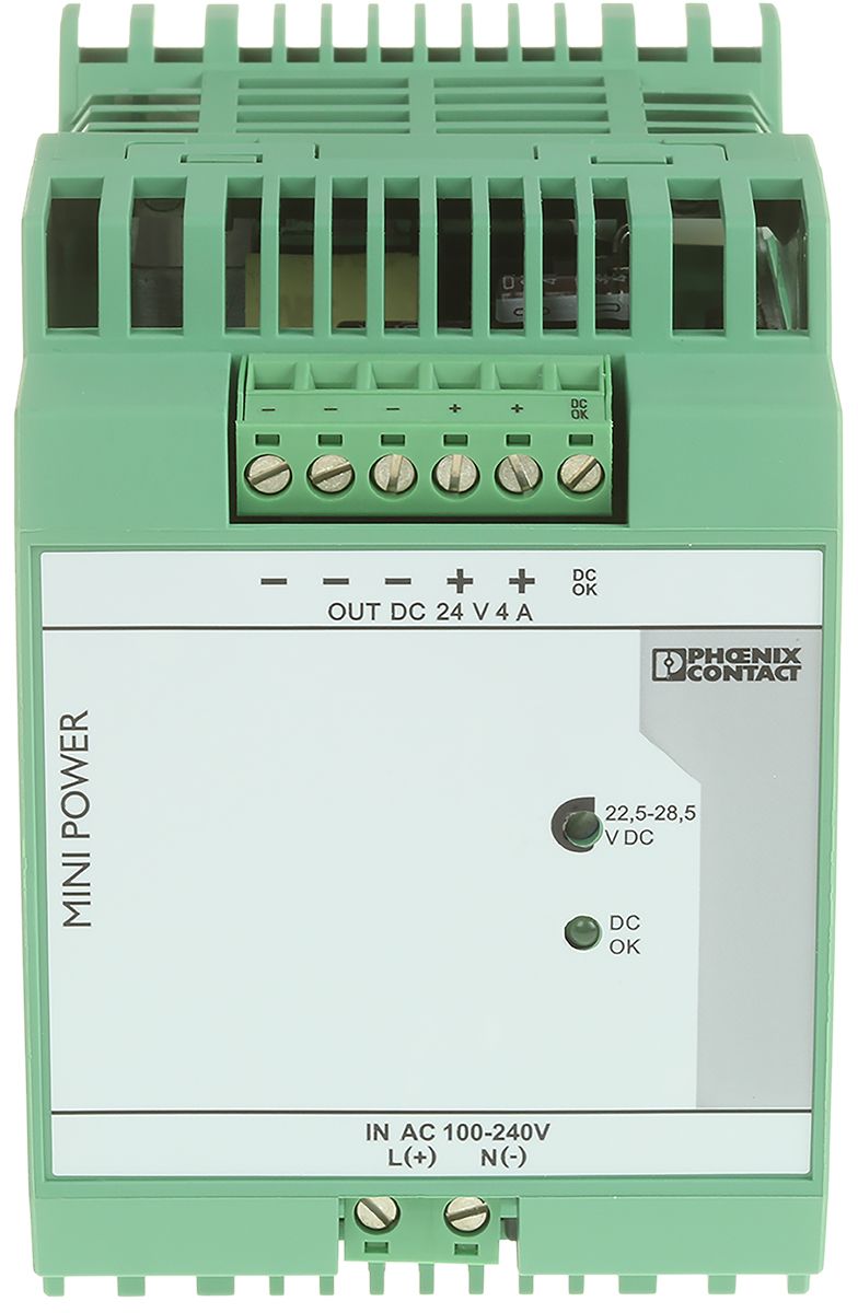 | Product description | Phoenix Contact MINI-PS-100-240AC/24DC/4 Switch Mode DIN Rail Power Supply 85 → 264V ac Input, 24V dc Output, 4A |
