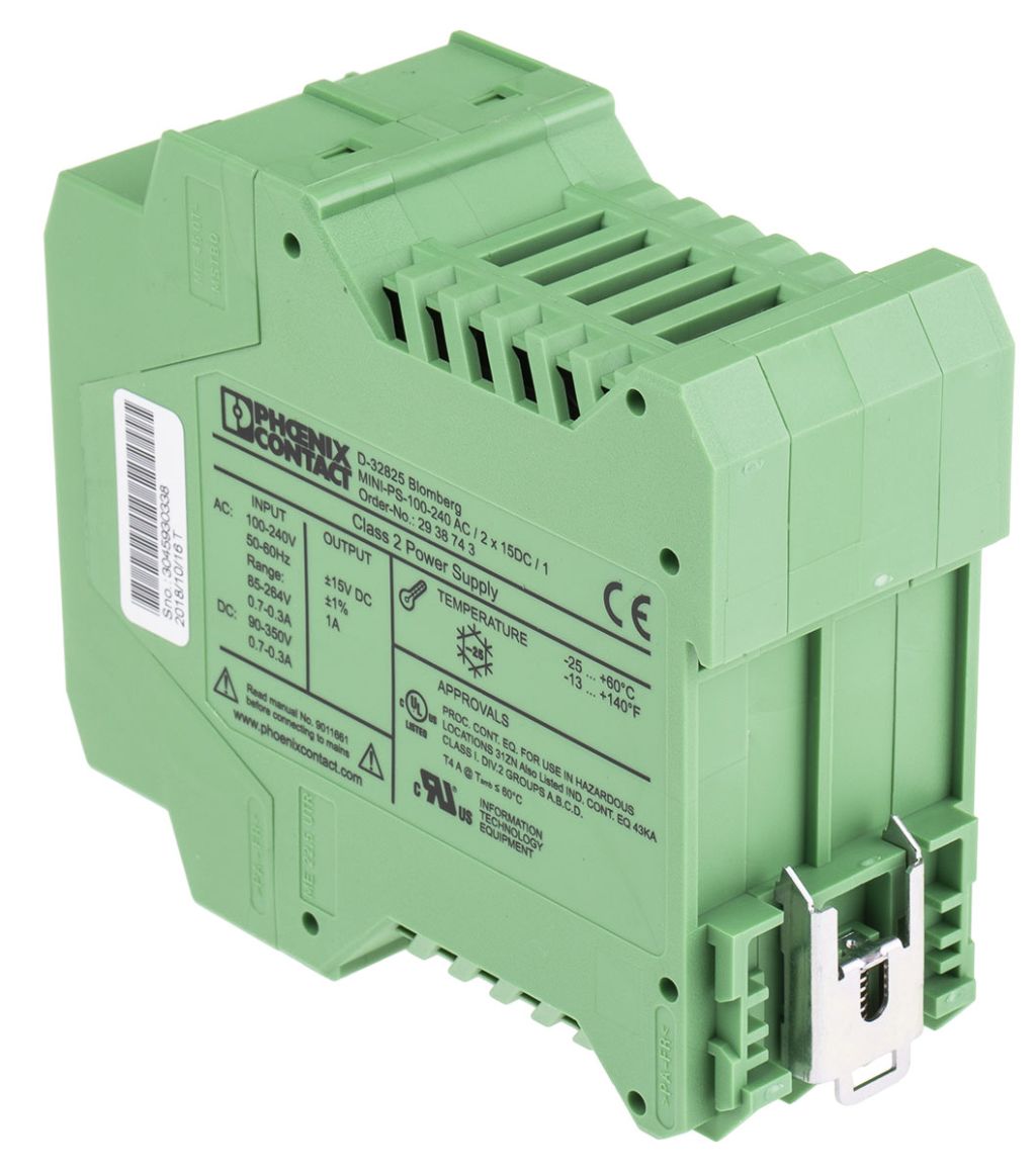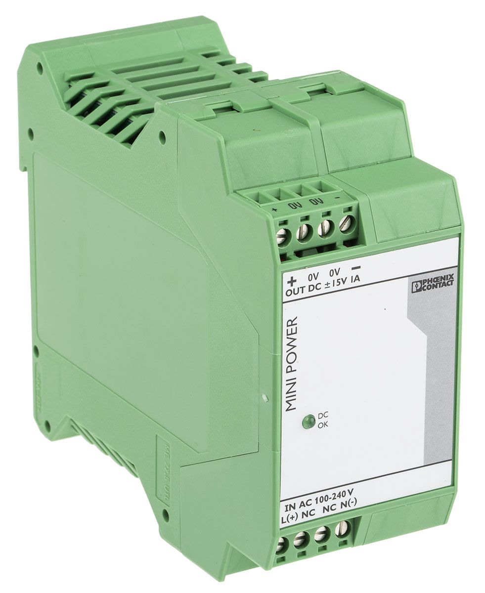 Phoenix Contact MINI-PS-100-240AC/2x15DC/1 Switch Mode DIN Rail Power Supply 85 → 264V ac Input, 15V dc Output,