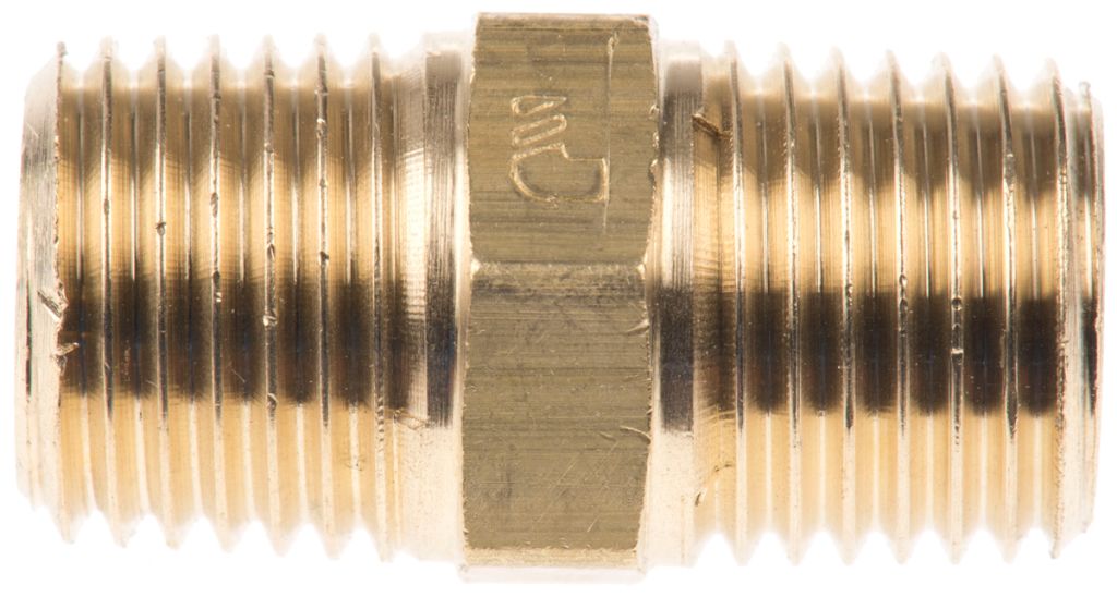 A brass double male adaptor with tapered BSPT threads available in three sizes. Temperature range -20 to +80°C.