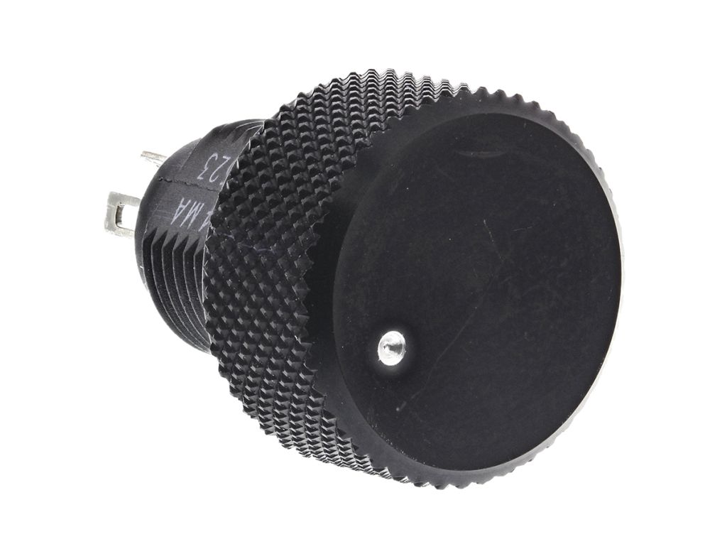 The P16 is a revolutionary concept in panel mounted potentiometers. This unique design consists of a knob driving and incorporating a cermet potentiometer. Only the mounting hardware and terminals are situated on the back side of the panel reducing to a minimum the required clearance.