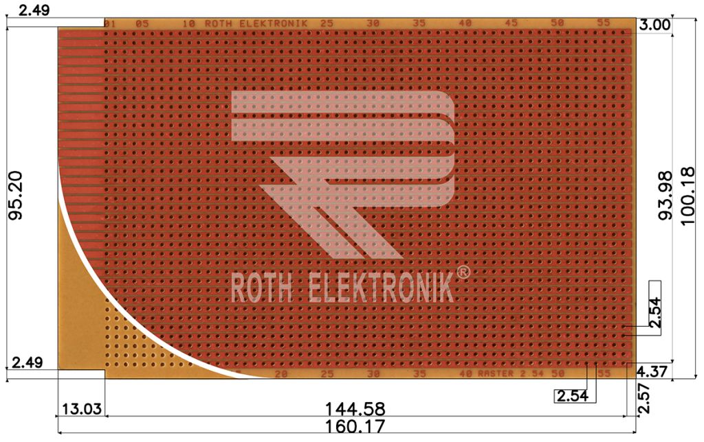 | Product description | RE523-HP, Single Sided 37-Way Edge Eurocard PCB FR2 With 37 x 57 1mm Holes, 2.54 x 2.54mm Pitch, 160 x 100 x 1.5mm |