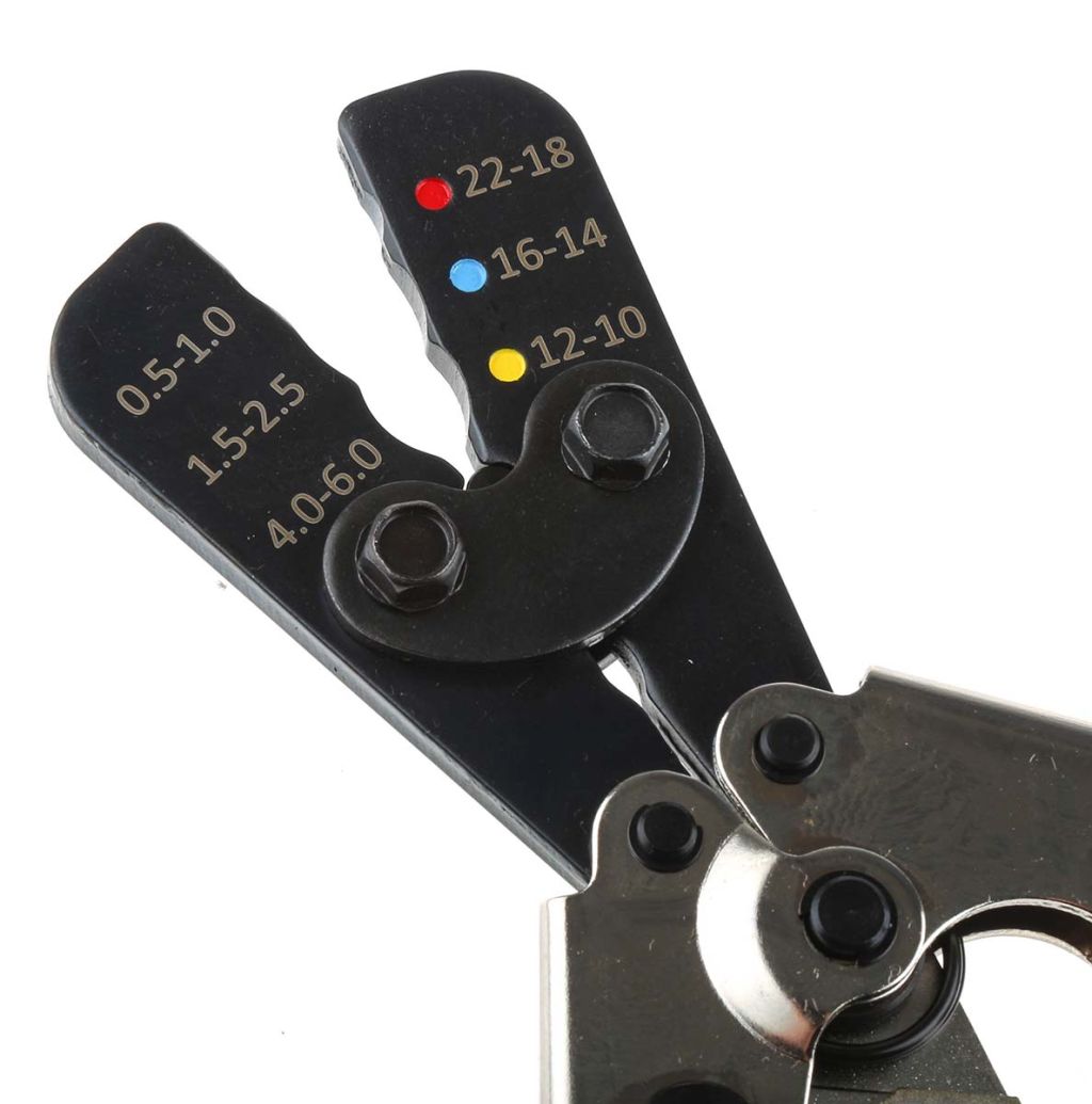 A ratchet crimp tool from RS Pro, designed to be used with insulated terminals. This handy tool has a plier action for wire stripping and cutting plus clearly defined colour markings letting you know which area to choose. Supports wire size range of 22 to 10 AWG and has a ratchet incorporated into the design preset to release when 35-45 lb is applied-approx. 1 2/4 in from the end of the handles.
