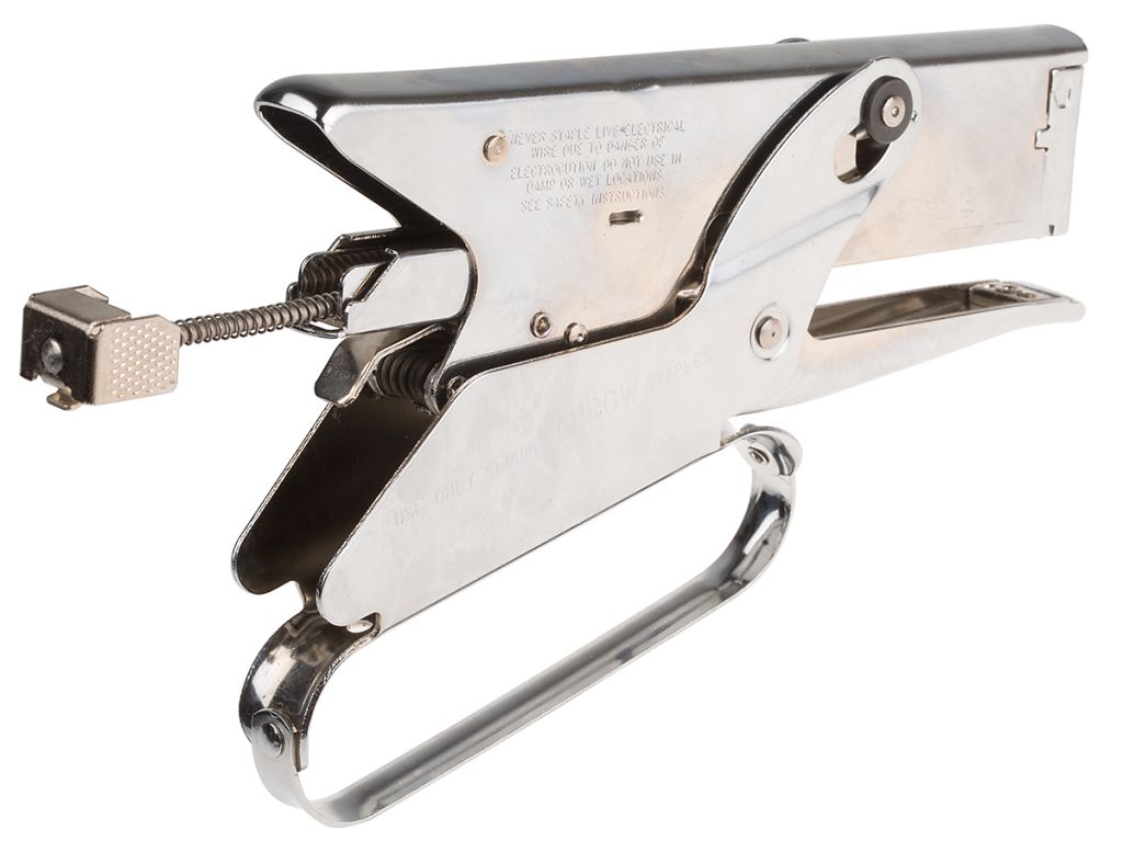 A handheld, plier action stapler of all steel construction with a durable chrome finish and easy to load mechanism